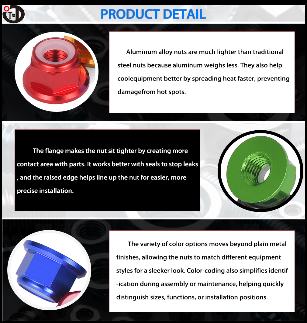 A porca de flange de liga de alumínio anodizada colorida é um fixador com função e beleza em seu desempenho. A liga de alumínio é leve e resistente à corrosão, o que pode reduzir o peso total do componente e aplicar a uma ampla gama de ambiente. A superfície da porca recebe tratamento de superfície especial para atender ao requisito de seleção de cores.