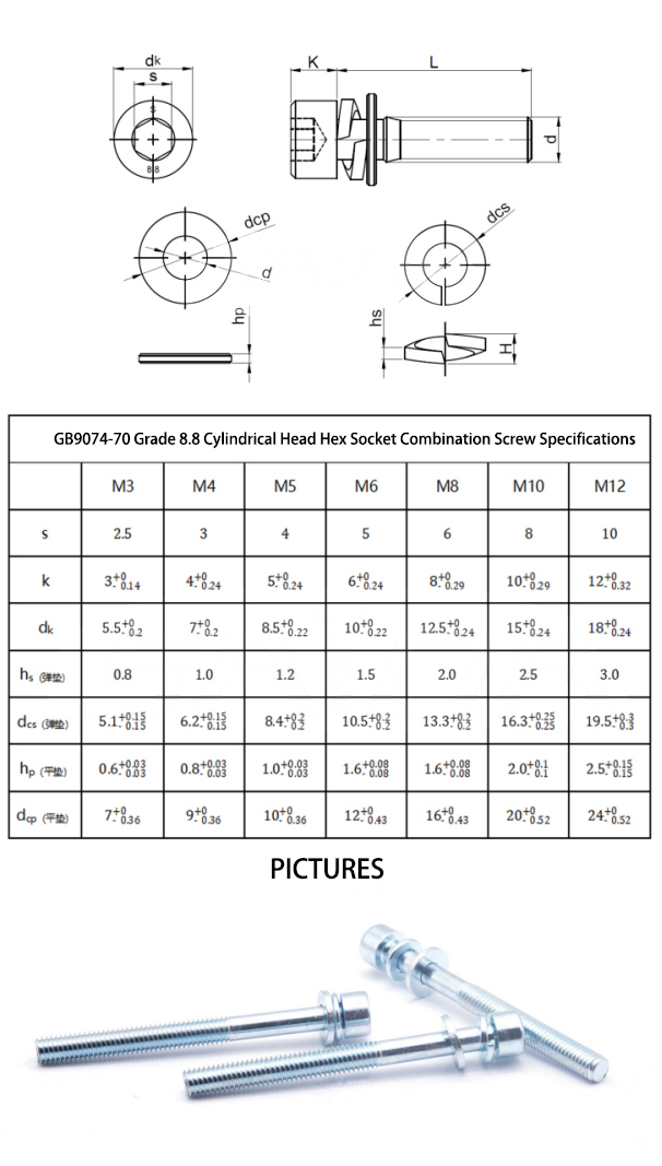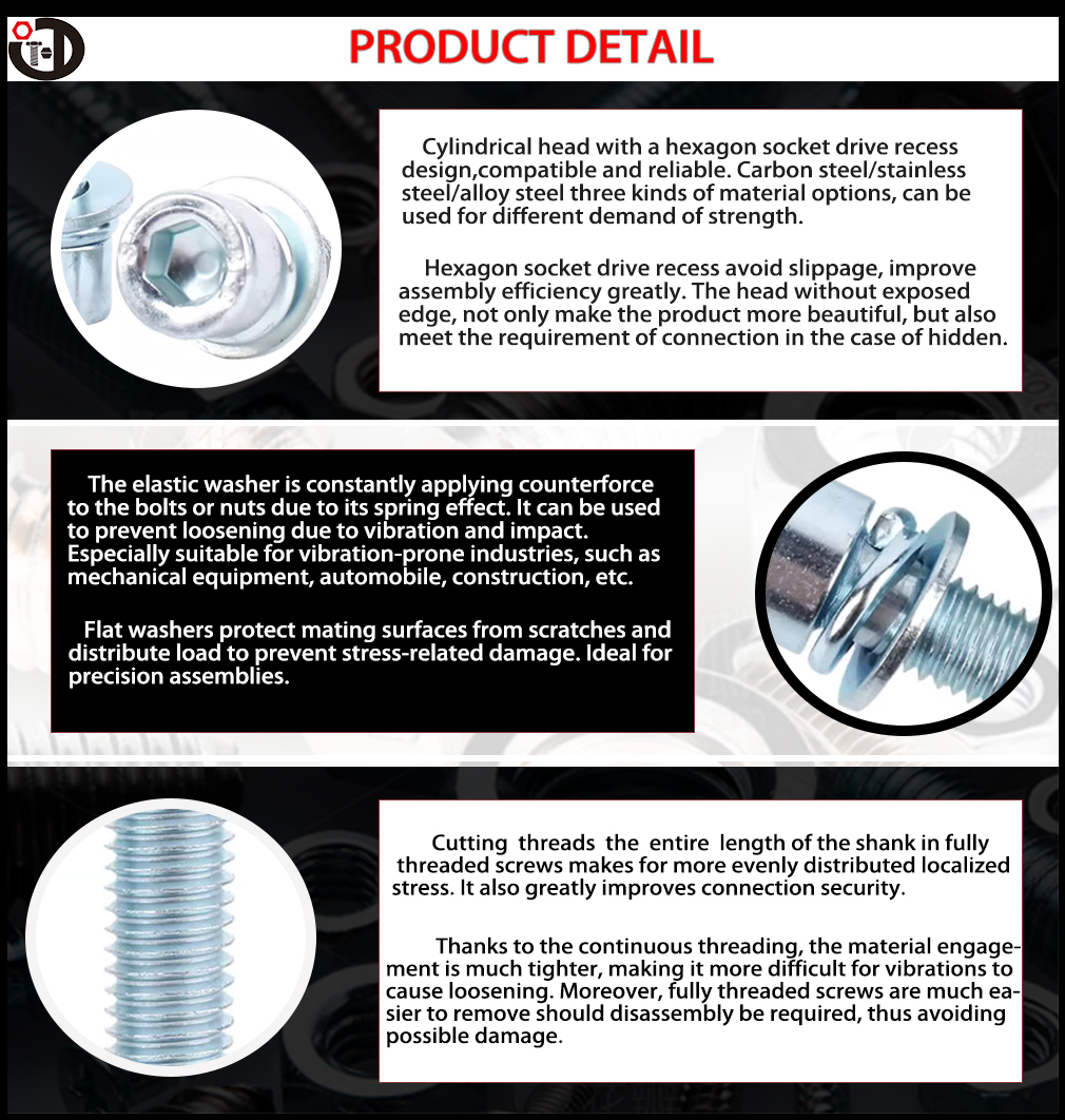 O parafuso de tri-grip de soquete hexáticos da cabeça do cilindro se destaca na transmissão de alto torque e na instalação de baixo perfil, graças à sua unidade de soquete hexadecimal de precisão e design da cabeça cilíndrica. A estrutura de tri-componente integrada (parafuso + arruela plana + arruela de mola) simplifica a montagem, evitando afrouxamento e aprimoramento da resistência à vibração, tornando-o ideal para aplicações de carga dinâmica. Amplamente utilizado na fabricação de máquinas, indústria automotiva, eletrônicos e instrumentos de precisão, fornece soluções confiáveis para desmontagem de alta frequência ou conexões críticas.
