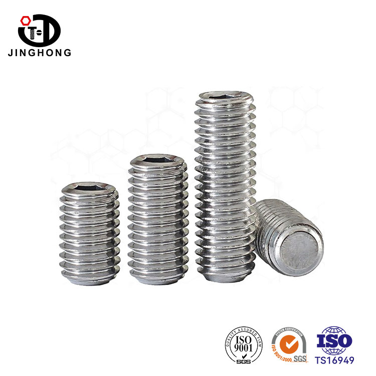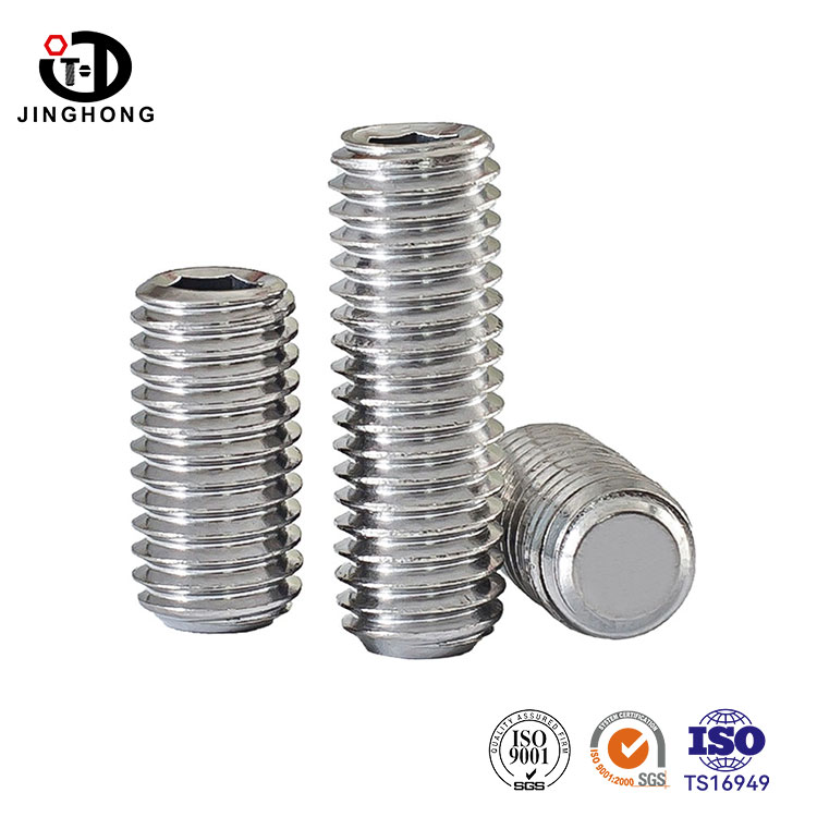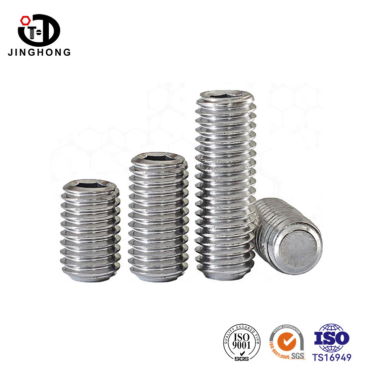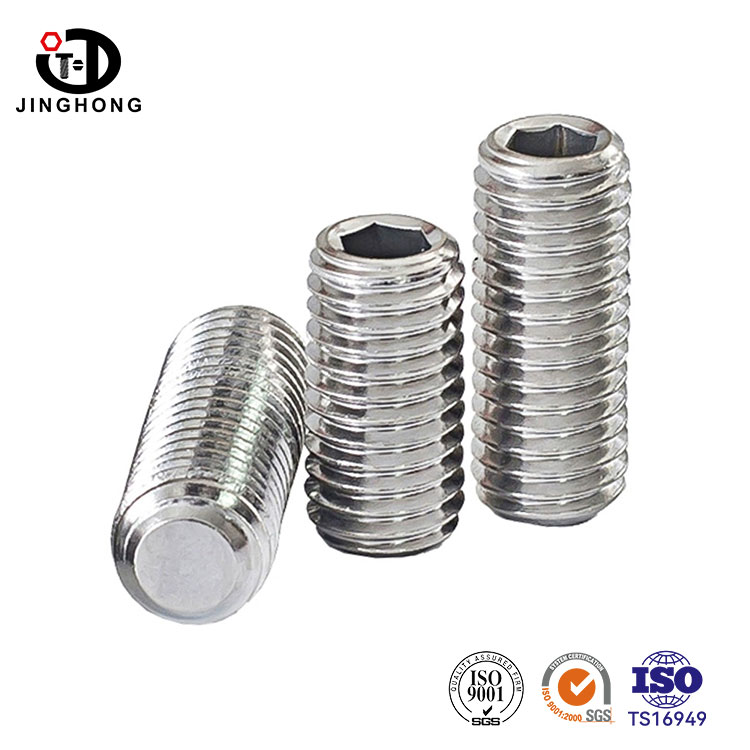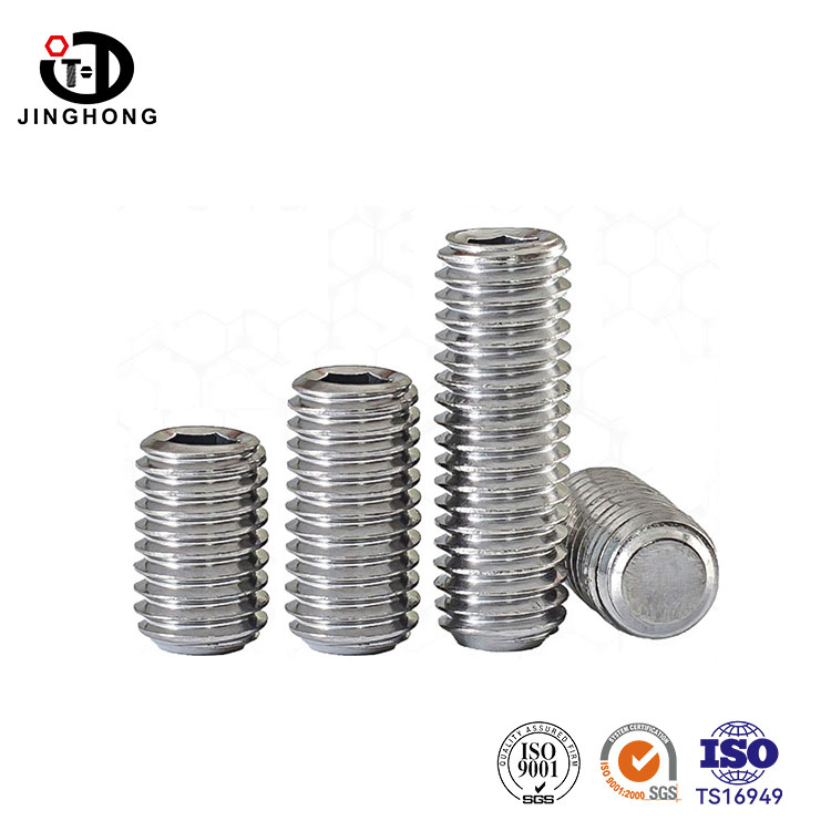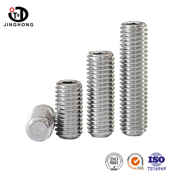 Os parafusos sem cabeça de aço inoxidável da Jinghong estão disponíveis em uma ampla variedade de tamanhos, e aços inoxidáveis como SUS304 e SUS316 geralmente estão disponíveis em estoque. Faixa de tamanho de M2-M24, comprimentos variam de 2 mm a 100 mm. Os produtos cobrem parafusos sem cabeça DIN913, DIN914, DIN915 e DIN916.
